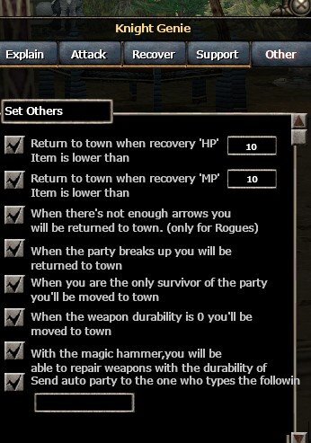 System Posted February 8 Share Posted February 8 🤖 Advanced Genie System – Guide The game features an advanced Genie system that allows automatic combat, recovery, and support actions. 📦 Genie Usage & Requirements Purchase Genie + Auto Loot from PUS (sold as a package) Exchange the item at Kaira NPC (Moradon) to activate ❌ No premium required ❌ No level requirement 🧭 Genie Menu Start / Stop / Settings buttons control the Genie Use the box at the bottom-left to save the monster you want to attack ⚔️ Attack Section Place desired skills into the Skill Register Set Attack Mode to ENABLE Attack Range: Adjusts how far your character can attack from ❤️ Recovery Section Place HP and MP potions Adjust the percentage bars for potion usage Set each section to ENABLE to activate auto-recovery 🛡️ Support Section Add support skills or scrolls Example: HP Scroll, Wolf, 1500 Buff ✔ Enable Party option if you want party members to benefit ⚙️ Other Settings Return to town when HP potions reach a set amount Return to town when MP potions reach a set amount Example: Enter 10 → returns when 10 pots remain (Archers) Return to town when arrows run out Return to town if party disbands or you are expelled Return to town if you are the only one left in the party Return to town when weapon durability reaches zero If weapon or armor durability reaches zero and you have a Genie Hammer, it will auto-repair Link to comment Share on other sites More sharing options...
